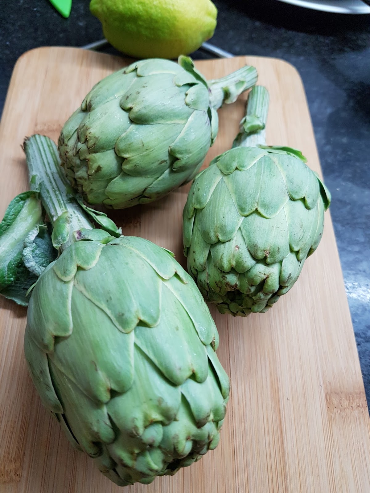 - Limpiamos las alcachofas y dejamos el rabito, lo limpiamos bien, les ponemos limón q no se oxiden y se pongan oscuras, cocemos, durante 15 / 20 minutos, escurrimos.
